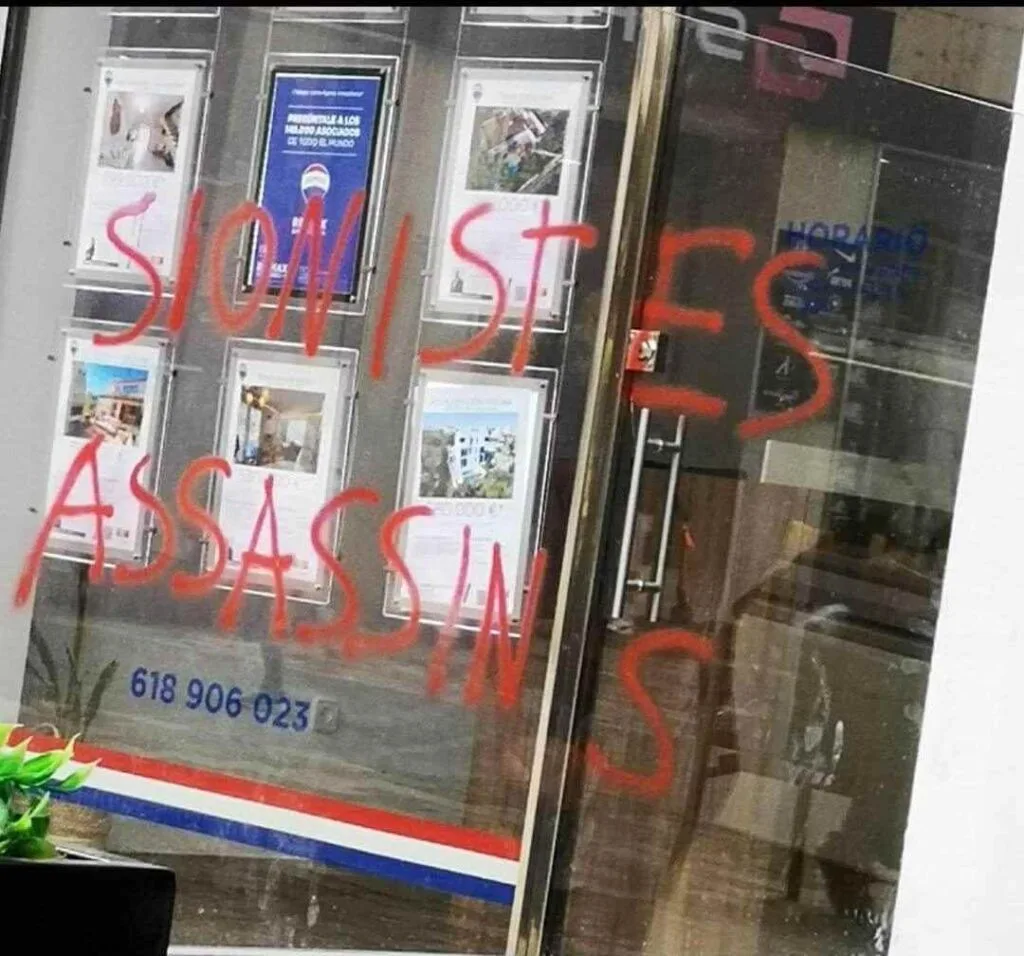 En los cristales del escaparate han aparecido pintadas de grandes dimensiones en color rojo con el mensaje: «SIONISTES ASSASSINS».